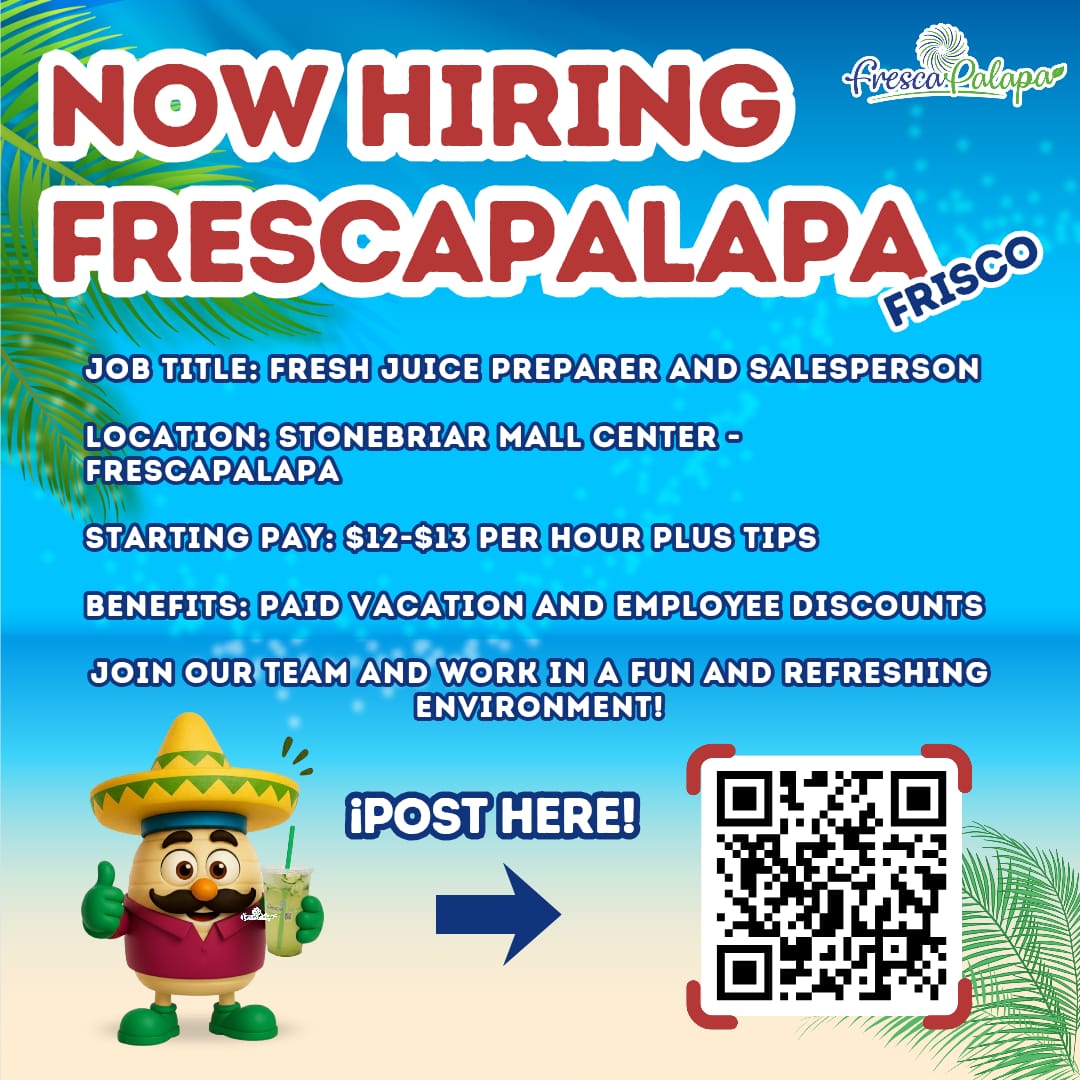 We just opened a new Frescapalapa location in Frisco and we’re looking for motivated, friendly people to join our team! 🌴🥤