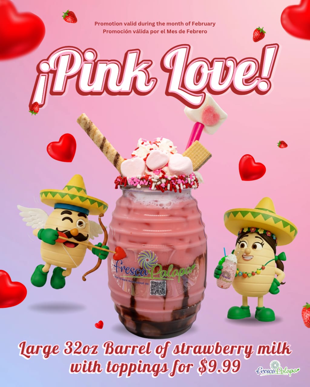 Fall in love this February with our special Pink Love drink at Frescapalapa. Enjoy a delicious large 32oz barrel of strawberry milk, topped with fun and colorful toppings.